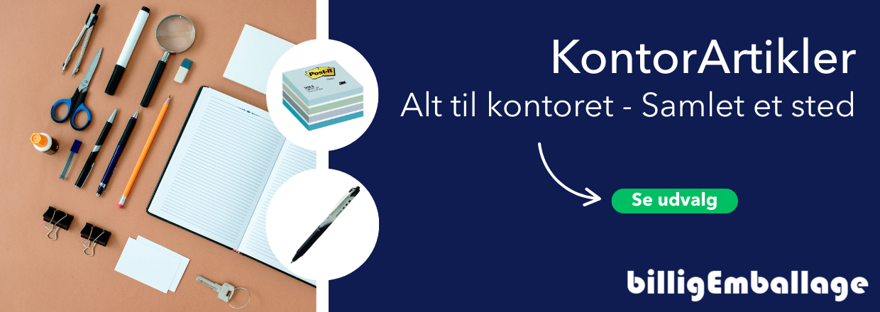 Som det nyeste hos os, kan du nu også købe dine kontorartikler lige her. Vi fik en stigende efterspørgsel på produkter der var relateret til kontorartikler, og derfor valgte vi at udvide sortimentet også i denne retning. Man kan måske diskutere om vi er nettets billigste leverandør af kontorartikler, hvilket vi nok ikke er endnu. Vores flow på kontorartikler er endnu ikke ret stort, og derfor kan vi heller ikke købe til rette priser endnu. Men produkterne er der, og skulle du mangle noget inden for kontorartikler, så kan du i hvert tilfælde købe dem her hos, os sammen med dine øvrige produkter. Vi har en hel del forskellige typer af kontorartikler, så der bør være det du leder efter. Vores sortiment udvides løbende og vi arbejder ud fra idéen om en slagt "shop i shop" på siden. Så du når du søger efter kontorartikler føler at du er i et univers for kontorartikler, som minder om den emballage shop du kender, men ikke er rodet alt for meget sammen. Vi håber vores kunder kan se fordelen i at samle deres indkøb af emballage og kontorartikler ét sted. Vi pakker en del ordre efterhånden med den type "blandede" ordre. Derfor tror vi på det er vejen frem for os og vores kunder.